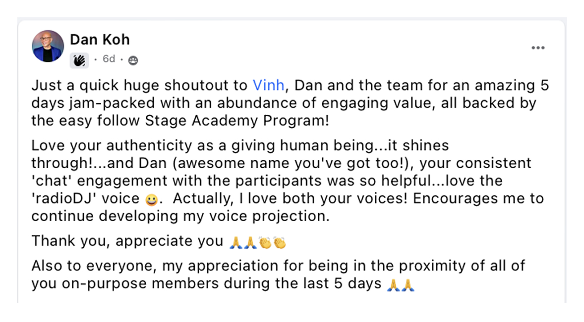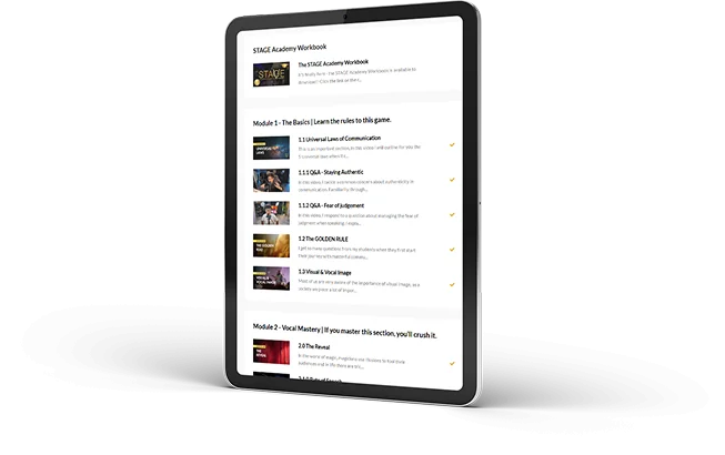STAGE Academy distils Vinh Giang’s proven frameworks into a structured online experience that teams can complete around work, then apply the same day.